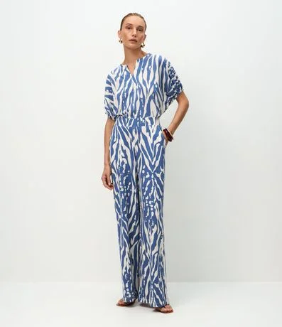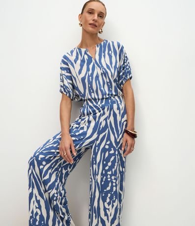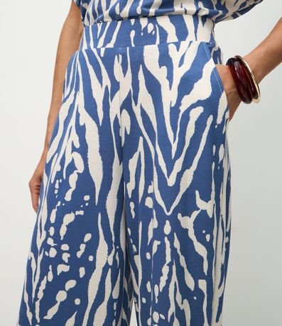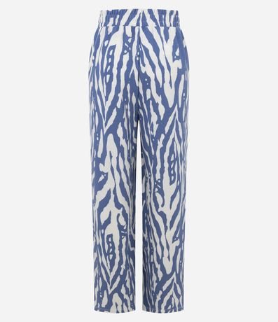 Ref: Calça feminina confeccionada em malha piquet, de modelo wide leg, com cós largo e estampa animal print de zebra com estilo abstrato.