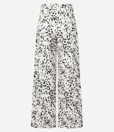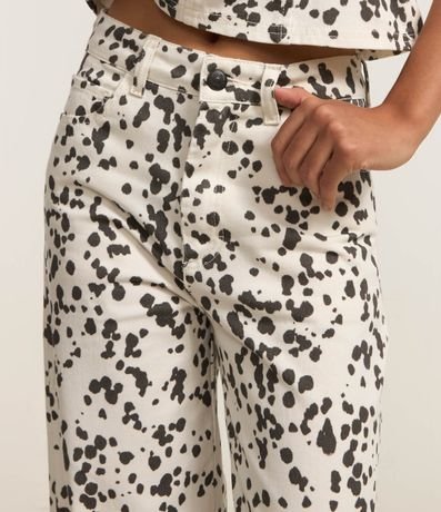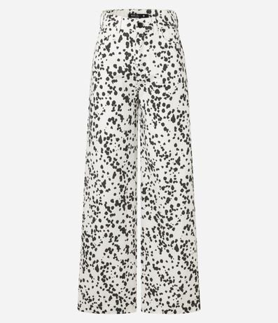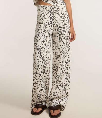 Calça wide leg, confeccionada em sarja com algodão bci mais sustentável, passantes no cós e estampa animal print, dálmata.