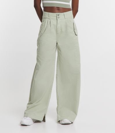 Ref: Calça feminina confeccionada em sarja com bolsos com lapela, pences e fenda na barra.