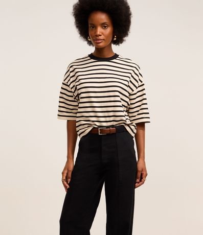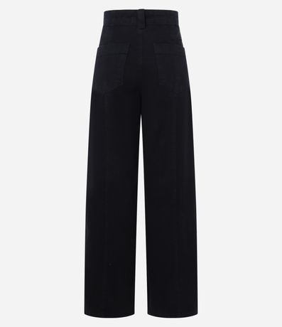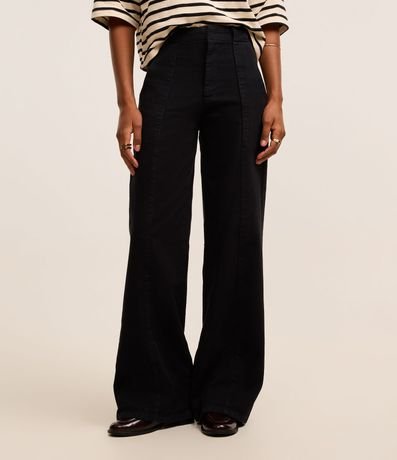 Ref: Calça wide leg em sarja mais sustentável, cós com passantes, vista oculta e detalhe em recortes.