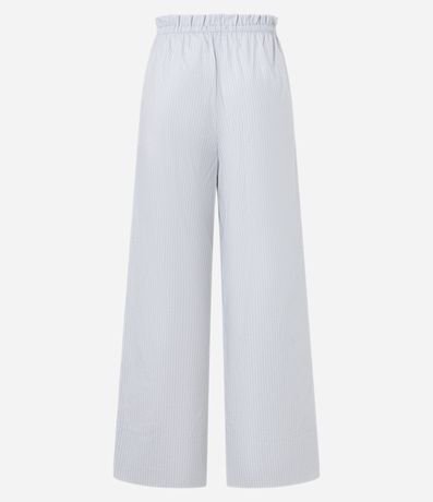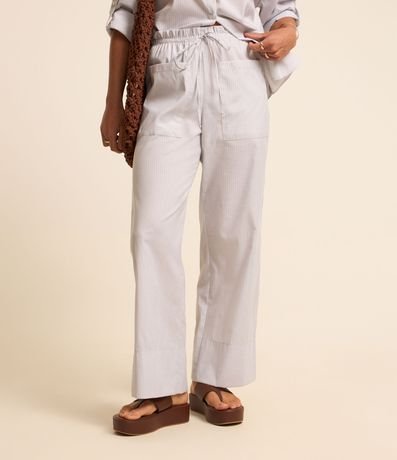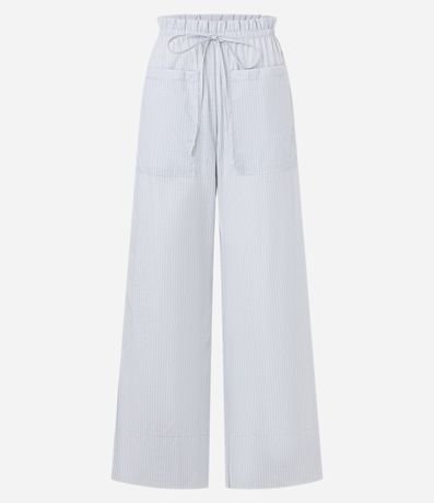Calça wide leg em tricoline com cós franzido com elástico e amarração na cintura, bolsos frontais e listras verticais em fios tintos.