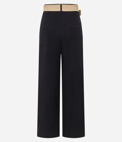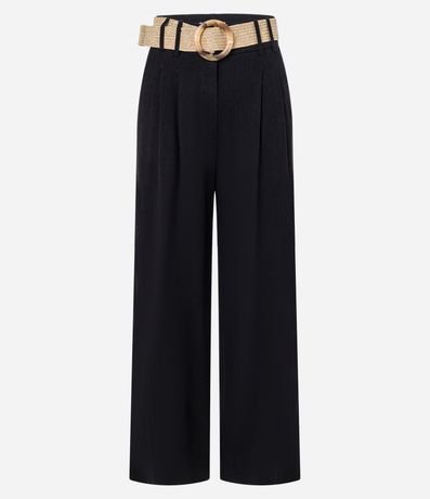 Ref: Calça wide leg de cintura alta confeccionada em viscolinho com fechamento tradicional e pregas. Possui cinto afivelado de ráfia.