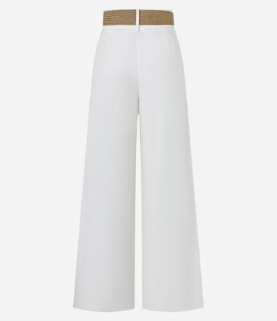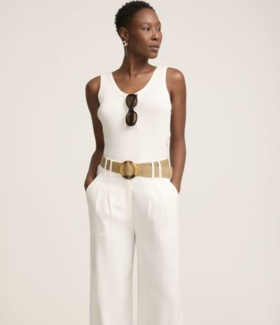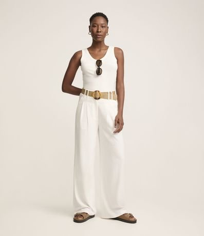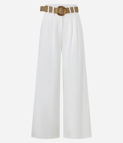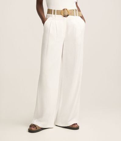 Ref: Calça wide leg de cintura alta confeccionada em viscolinho com fechamento tradicional e pregas. Possui cinto afivelado de ráfia.