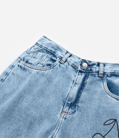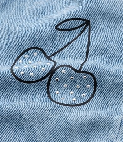 Calça infantil confeccionada em jeans mais sustentável, de modelo wide leg. Possui bolsos e estampa de cerejinhas e laços, com aplicação de pequenos brilhinhos.