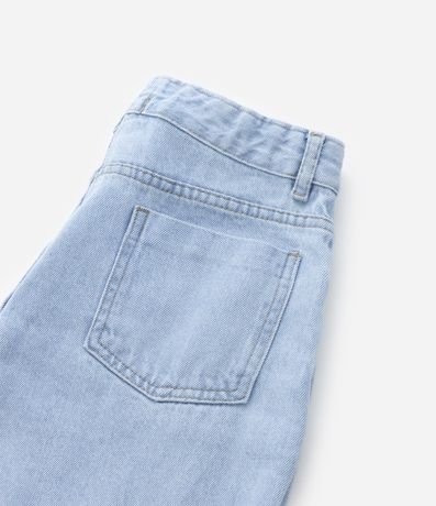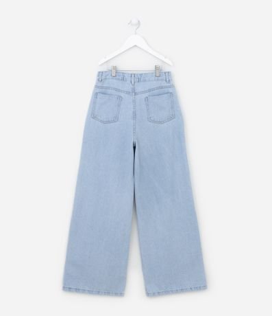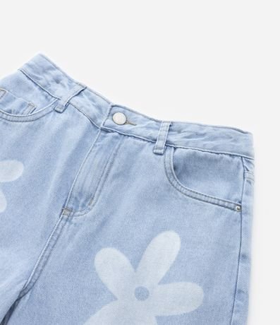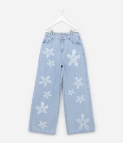Ref: Calça wide leg infantil em jeans com fixo, fechamneto por botão, bolsos laterais, traseiros e estampa de flores.