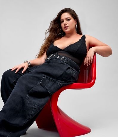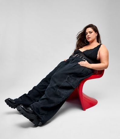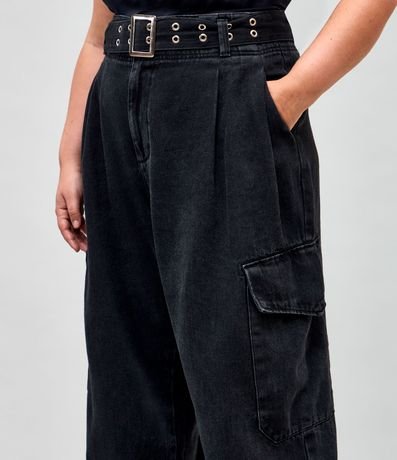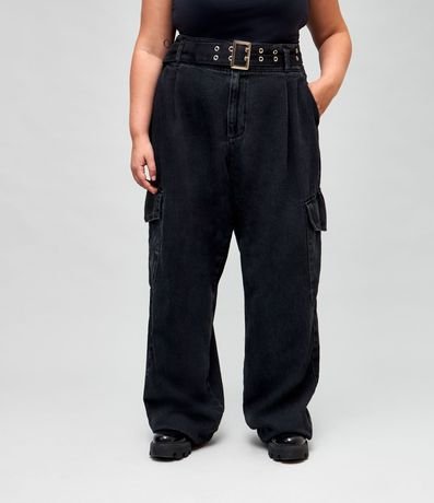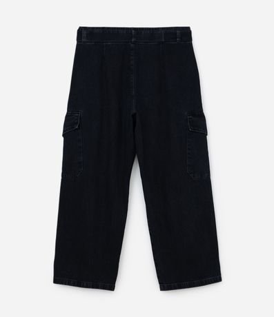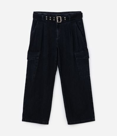 Ref: Calça jeans, modelo wide leg, com cintura média. A peça tem bolsos faca, bolsos cargo com lapela e cinto largo com ilhós.