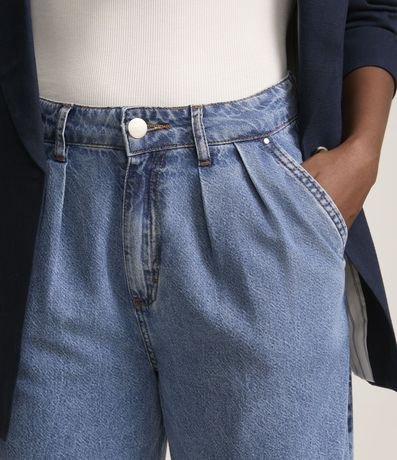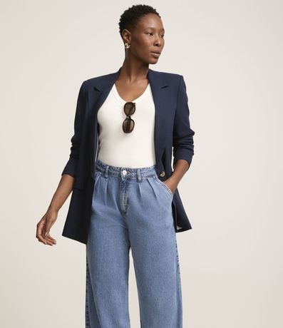 Calça jeans, wide leg com cintura alta, passantes no cós, pregas frontais e bolso alfaiatado.