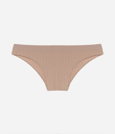 Calcinha biquíni em poliamida, com lateral média e textura canelada.
