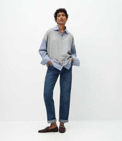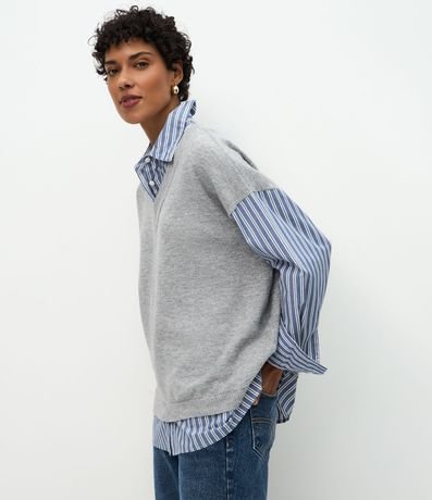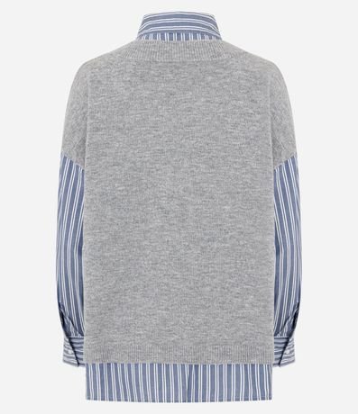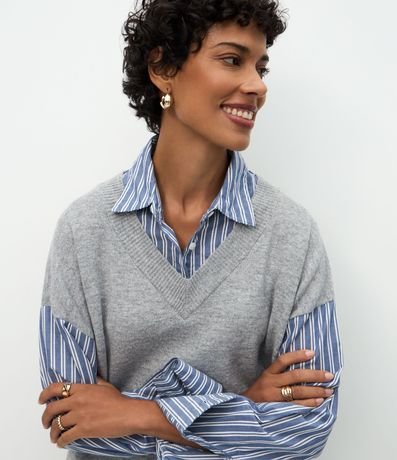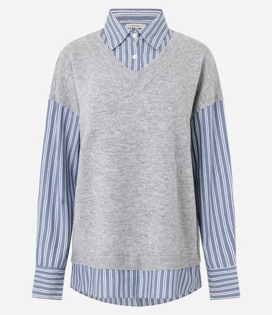 Camisa feminina com efeito sobreposto, unindo tricot leve na parte superior e camisa listrada de mangas longas. Possui decote V, punhos com botão, barra alongada e costas lisas. Estrutura combina malha macia e tecido plano para visual de dupla camada.