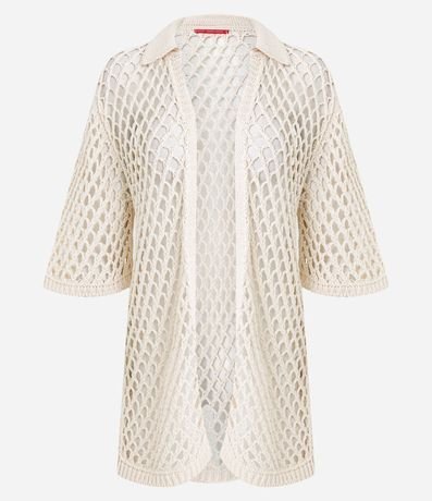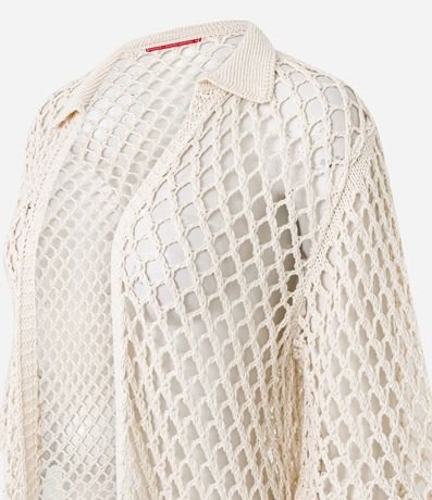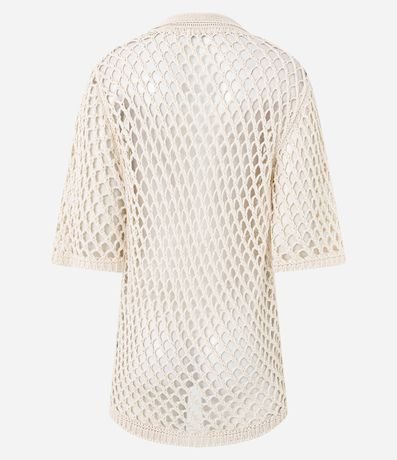 Ref: Camisa feminina confeccionada em algodão certificado BCI. Possui trama aberta estilo crochê, com padrão de laçadas ovais que criam efeito de rede. Possui comprimento alongado e modelagem solta. As mangas são médias e amplas,, gola dobrada, totalmente vazada, é ideal para sobreposição em looks de verão ou praia.