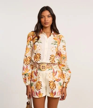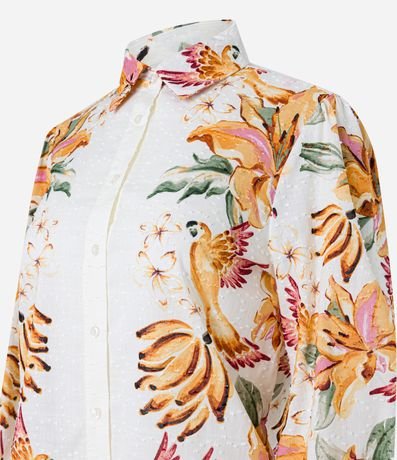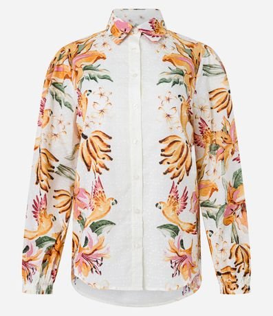 Ref: Camisa alongada com manga longa, confeccionada em cambraia com algodão bci mais sustentável e estampa tropical com pássaros, flores e bananas nas laterais.