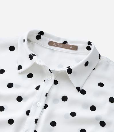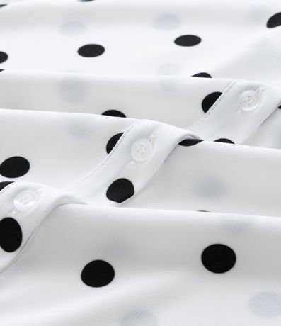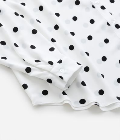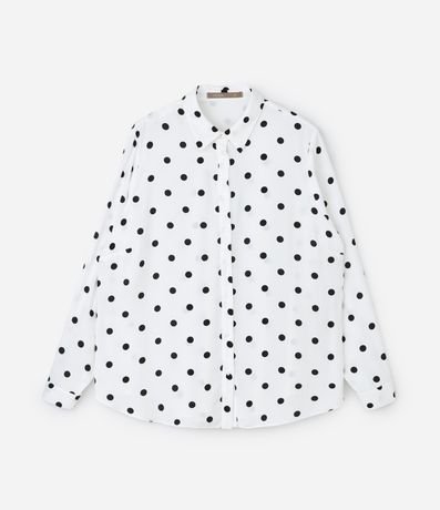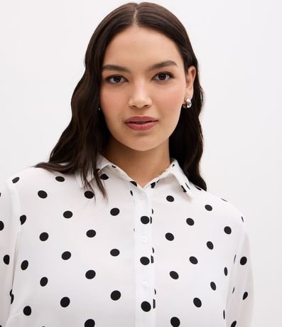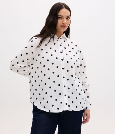 Camisa plus size confeccionada em crepe, de modelo alongada, com gola tradicional colarinho e mangas longas bufantes. Possui padronagem poá e abotoamento frontal com vista oculta.