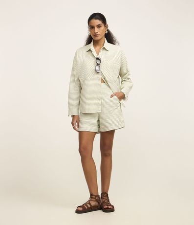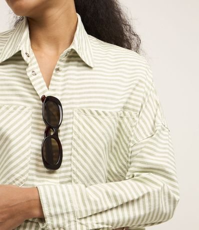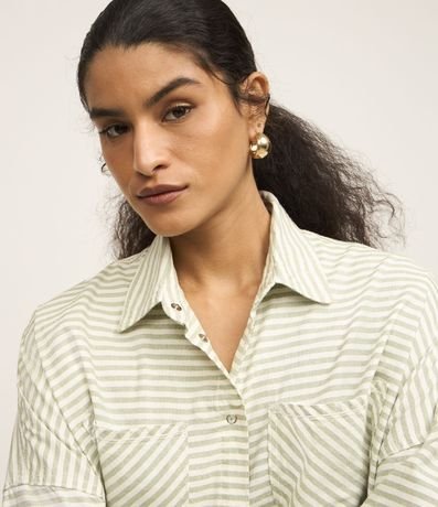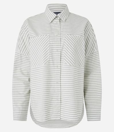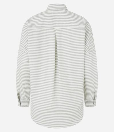 Ref: Camisa feminina confeccionada em jeans mais sustentável, com gola colarinho, abotoamento frontal, cava deslocada, manga longa, bolsos e estampa com listras diversas.