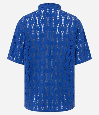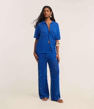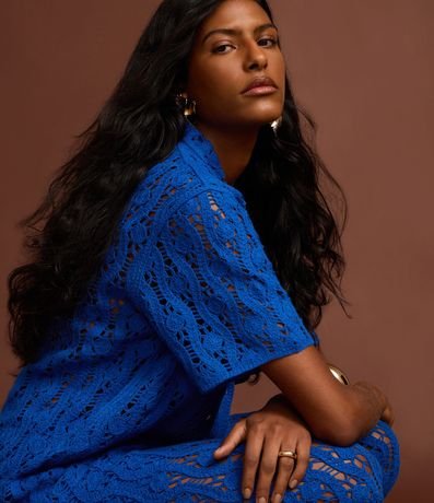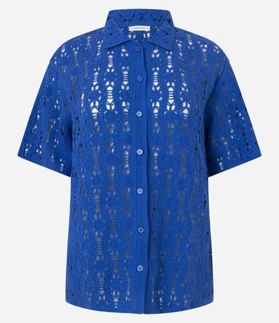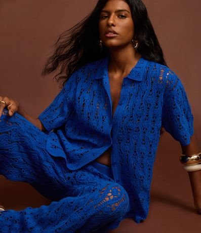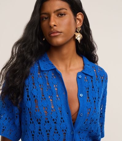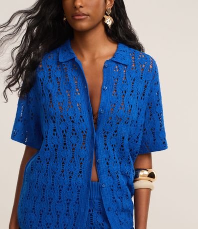 Ref: Camisa feminina de modelo alongado, confeccionada em tricô de material mais sustentável. Possui gola colarinho, mangas curtas, fechamento por botões e textura. Peça construída com mix de pontos com aberturas.