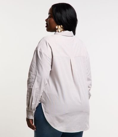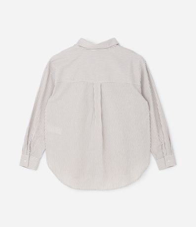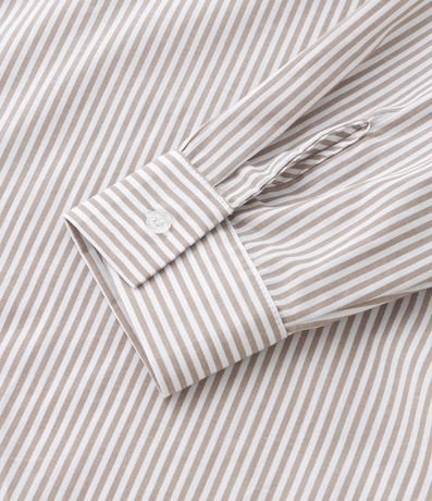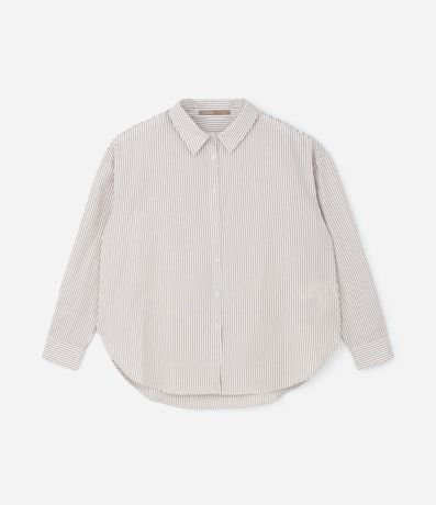 Ref: Camisa listrada, modelo alongado, confeccionada em tricoline de algodão mais sustentável. A peça tem mangas longas, abotoamento frontal, gola tradicional e barra arredondada.