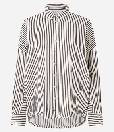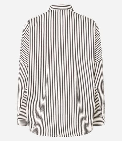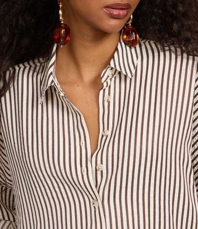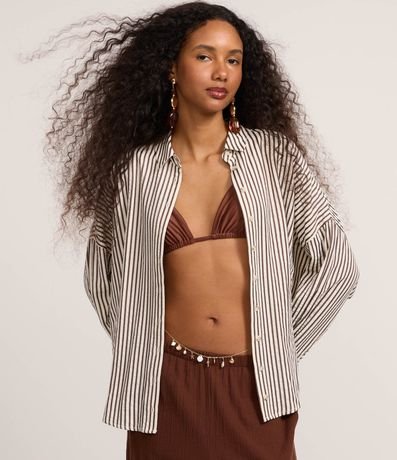 Ref: Camisa feminina confeccionada em poliéster mais sustentável. Peça amassadinha. com gola colarinho, manga longa, abotoamento frontal, estampa de listras e texturizada.