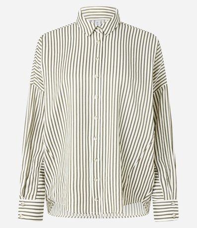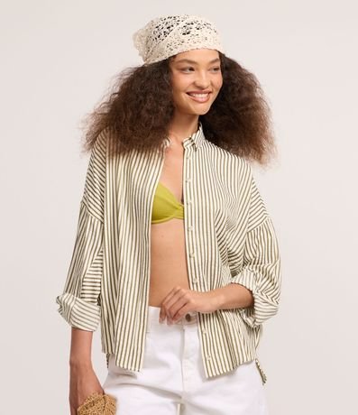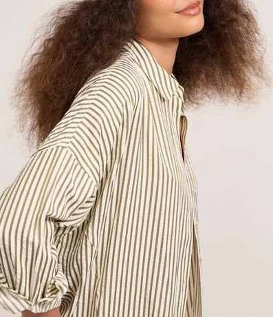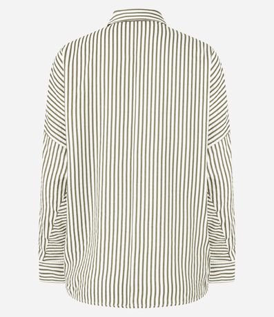 Ref: Camisa feminina confeccionada em poliéster mais sustentável. Peça amassadinha. com gola colarinho, manga longa, abotoamento frontal, estampa de listras e texturizada.