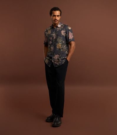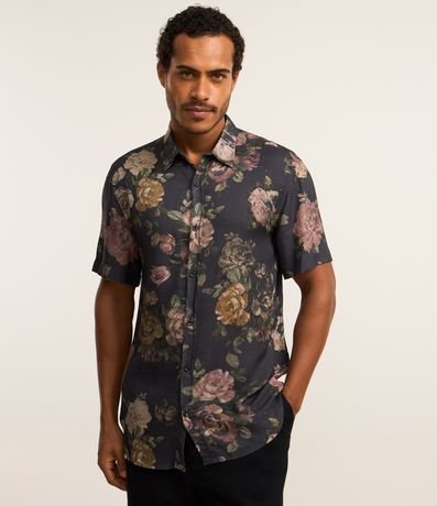 Camisa masculina confeccionada em anarruga mais sustentável com boas práticas ambientais, a peça possui gola colarinho, manga curta, abotoamento frontal e estampa floral.