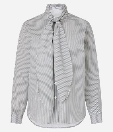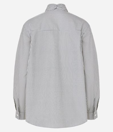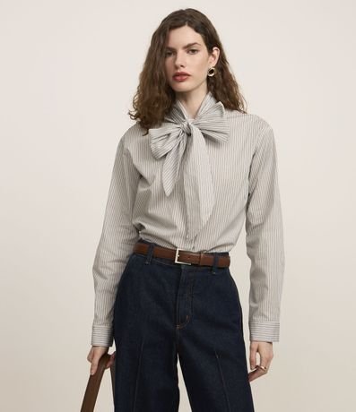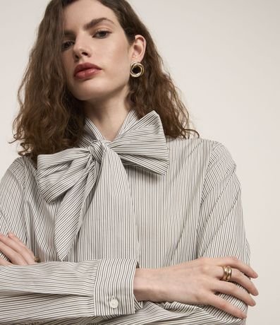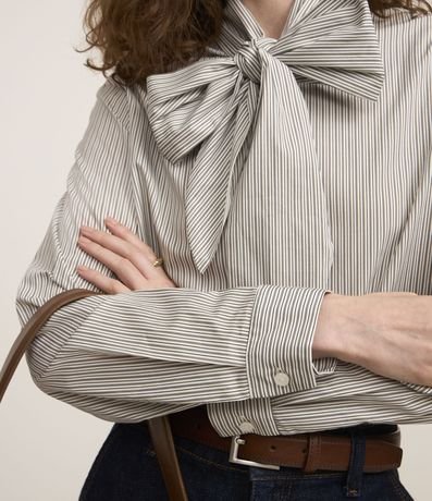 Camisa de mangas longas incorporada na tendência Boho Elevado, confeccionada em tricoline de algodão mais sustentável através de boas práticas ambientais. Dispõe de gola com laço robusto, abotoamento frontal e listras verticais em fios tintos.