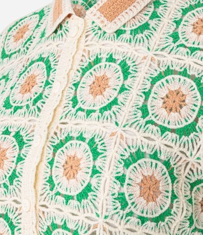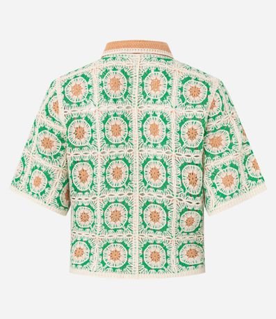 Ref: Camisa boxy confeccionada em tricô, com gola colarinho contrastante, manga curta, abotoamento frontal e estampa geométrica.