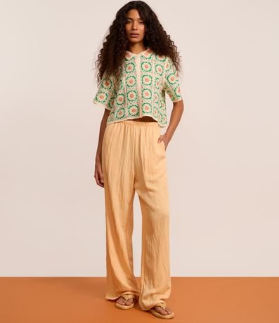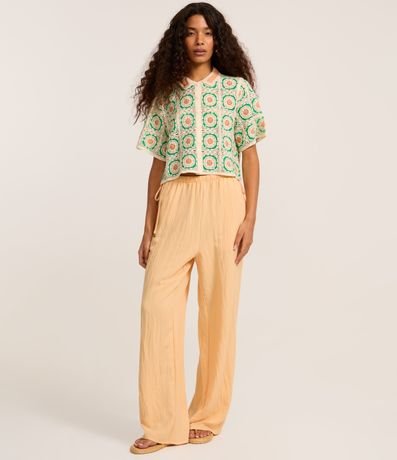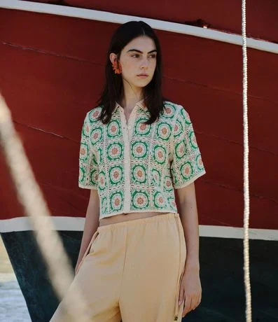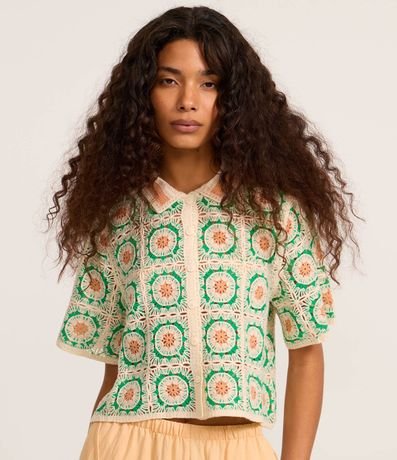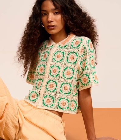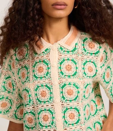 Ref: Camisa boxy confeccionada em tricô, com gola colarinho contrastante, manga curta, abotoamento frontal e estampa geométrica.