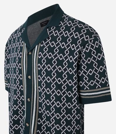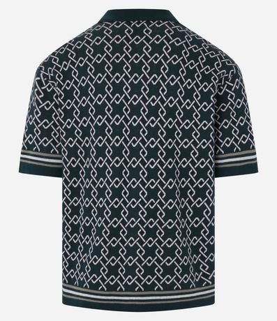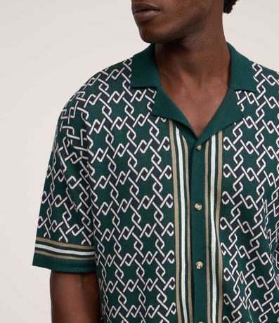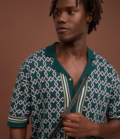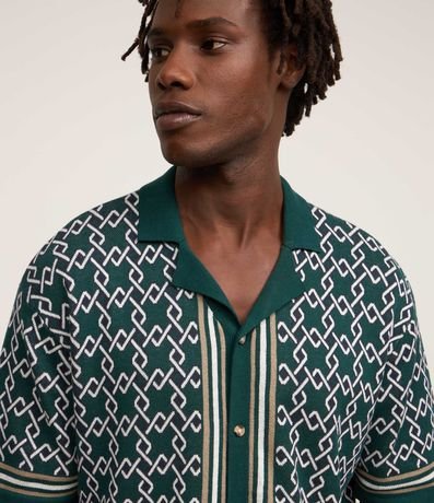 Ref: Camisa masculina confeccionada em algodão com malha dupla, que permite toque diferenciado interno e externamente, manga curta. Peça no modelo boxy, gola bowling, fechamento por botões, viés contrastantes e estampa de argolas.
