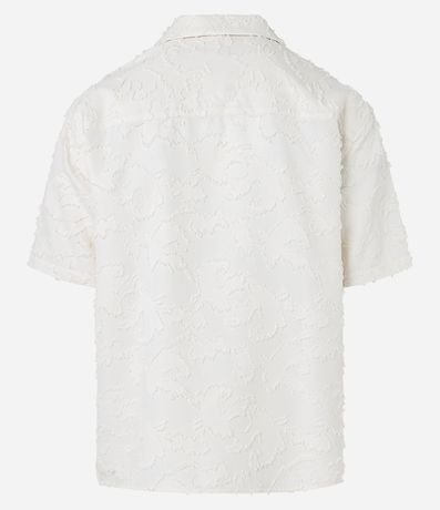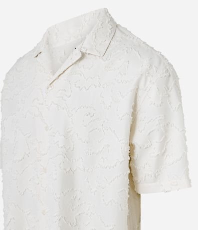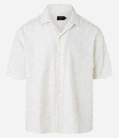 Ref: Camisa masculina no modelo boxy, com gola colarinho, abotoamento frontal, manga curta. Peça com textura devoré e detalhe navalhado.