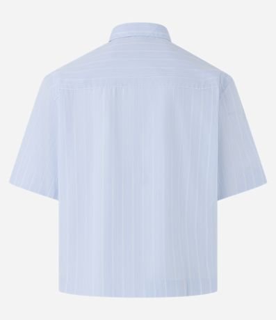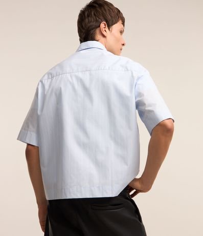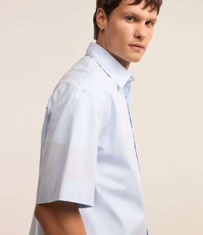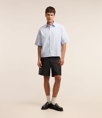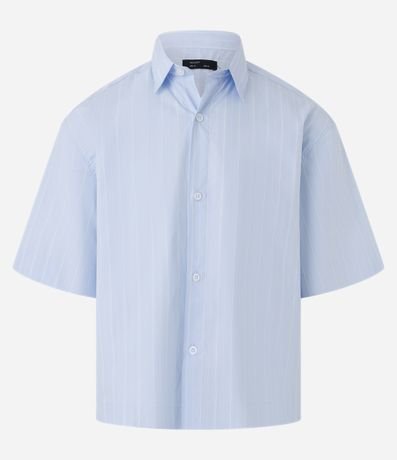 Camisa boxy masculina confeccionada em algodão, com gola tradicional e mangas curtas. Possui listras em fio tinto e abotoamento frontal total.