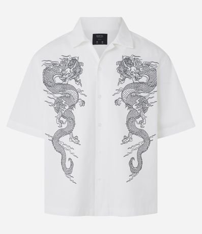 Ref: Camisa masculina confeccionada em sarja, gola colarinho, com manga curta e abotoamento frontal. Peça no modelo boxy com estampa de dragões.