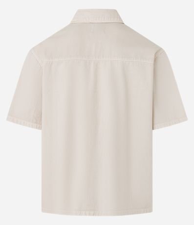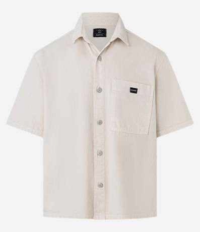 Ref: Camisa masculina boxy em sarja estonada, com gola colarinho, abotoamento frontal e bolso no peito. Visual urbano e despojado, com baixo consumo de água na produção.
