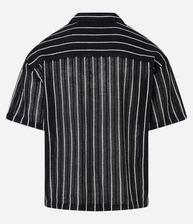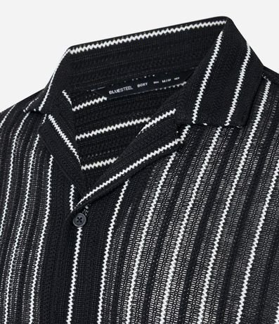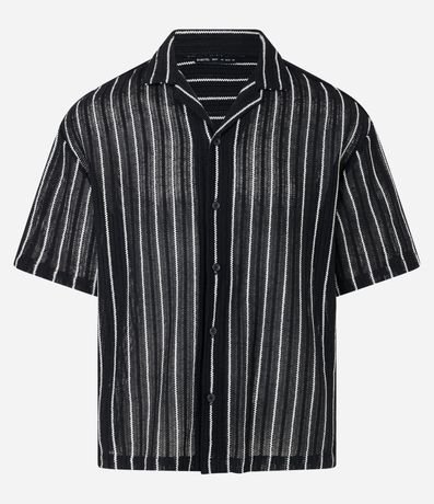 Camisa masculina de modelo boxy, confeccionada em tricô, com gola polo, manga curta, fechamento por botões e estampa listrada.