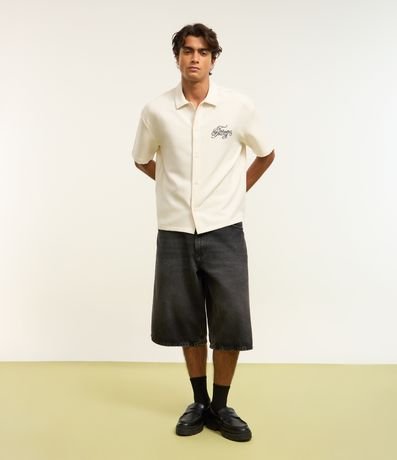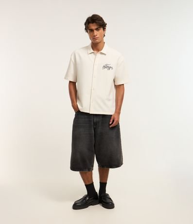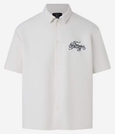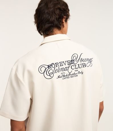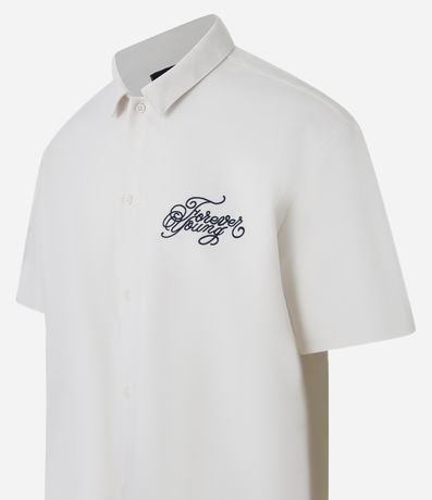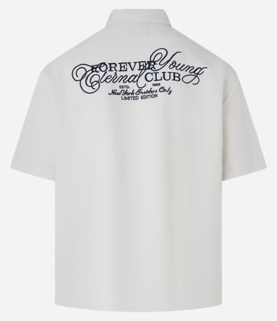 Ref: Camisa manga curta, modelo boxy com abotoamento frontal. Possui bordado em lettering Forever Young no peito e costas.