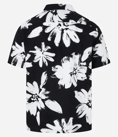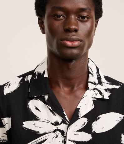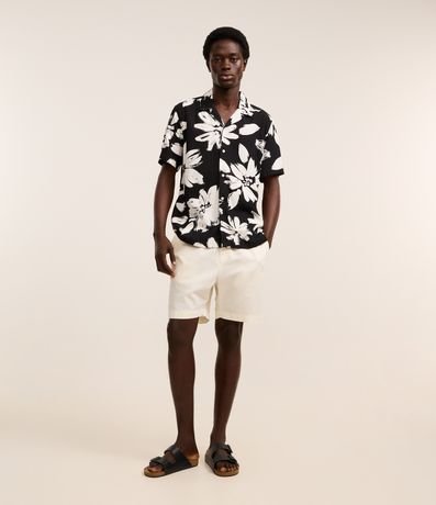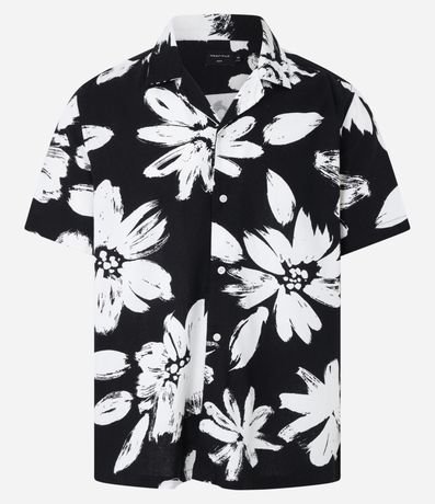Ref: Camisa masculina confeccionada com linho e viscose mais sustentável, gola bowling e manga curta. Peça no modelo boxy, abotoamento frontal, textura e estampa contrastante de flores.
