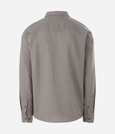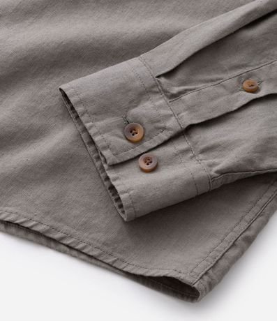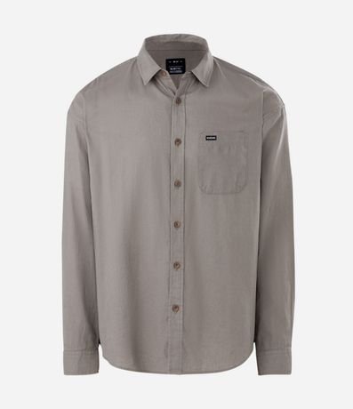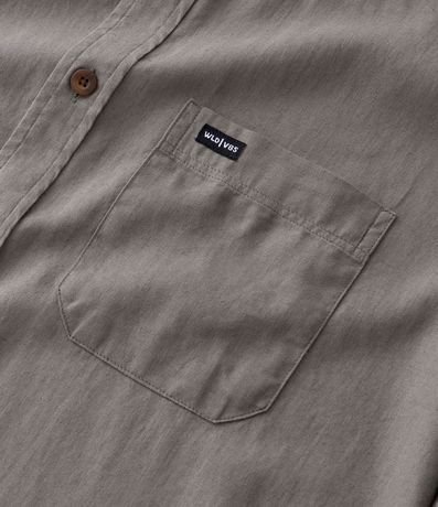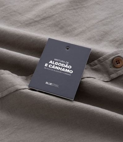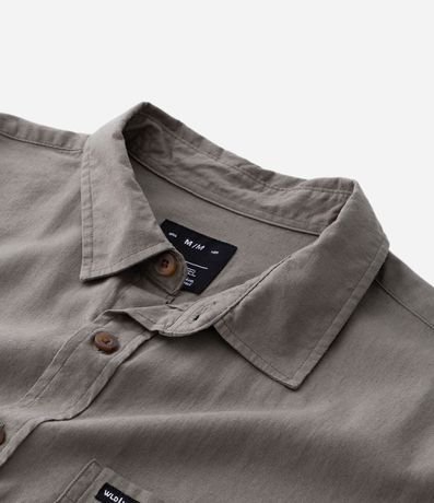 Camisa masculina em cânhamo, lisa, gola colarinho, bolso, abotoamento frontal.