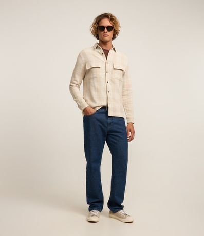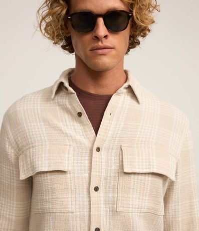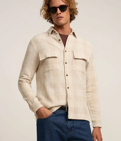 Ref: Camisa masculina confeccionada em algodão mais sustentável, gola colarinho, abotoamento frontal, manga longa. Peça com bolsos cargo, textura e estampa xadrez.