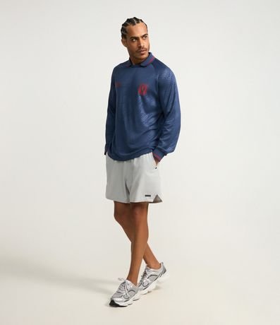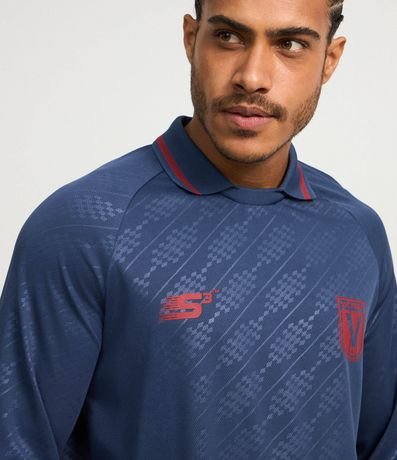Camisa masculina com gola polo com listra contrastante, mangas longas, punhos ajustados com listra contrastante, estampas localizadas no peito e estampa heatprint. A peça possui tecnologia dry.