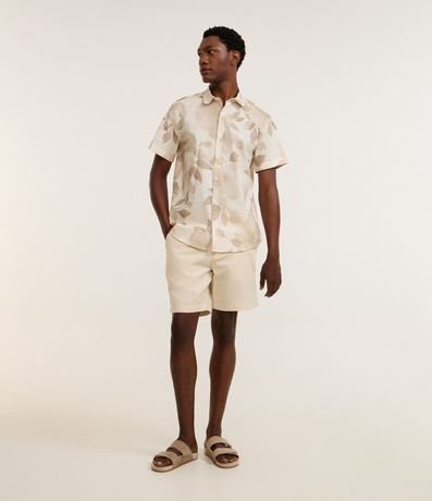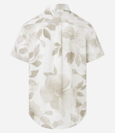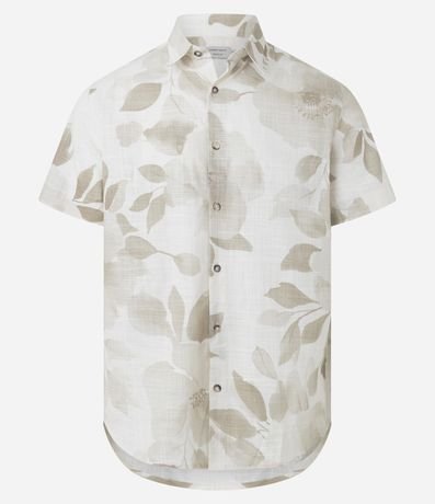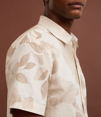 Ref: Camisa masculina modelo comfort com gola colarinho, manga curta e estampa floral folhagem, confeccionada em algodão certificado BCI, com boas práticas ambientais e toque de linho.