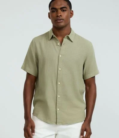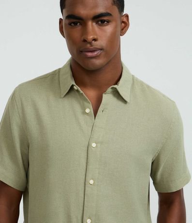 Camisa masculina confeccionada com algodão mais sustentável, gola colarinho, abotoamento frontal, manga curta. Peça no modelo comfort com textura.
