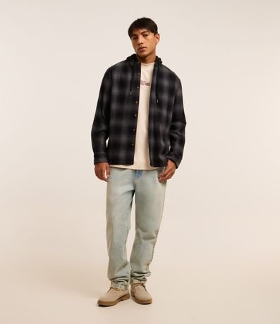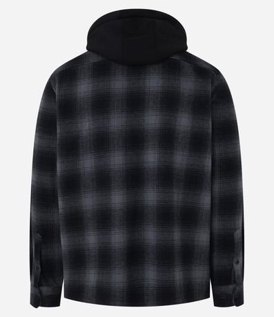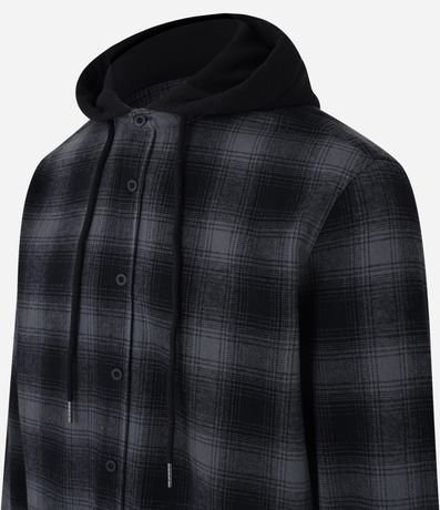 Ref: Camisa masculina modelo comfort em flanela, confeccionada em algodão mais sustentável, com capuz e manga longa. A peça possui estampa xadrez, cordões para amarração no capuz e abotoamento.