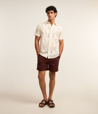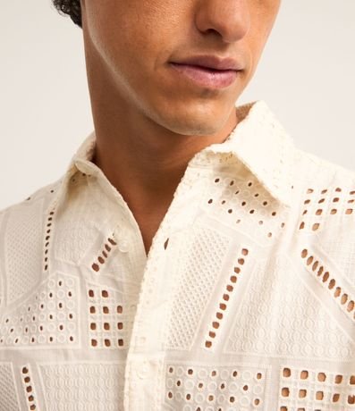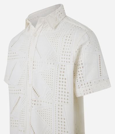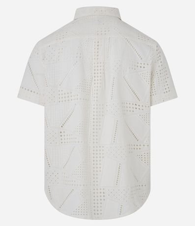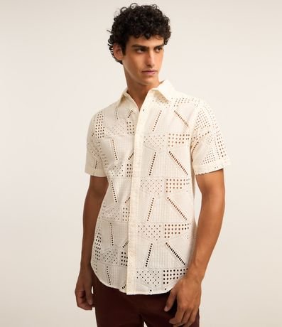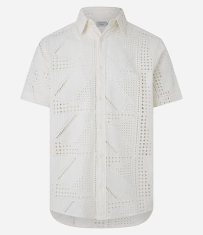 Camisa comfort masculina, peça com gola colarinho, abotoamento frontal e manga curta. A textura patchwork remete aos trabalhos manuais antigos com formas geométricas, furinhos e texturas em alto relevo.