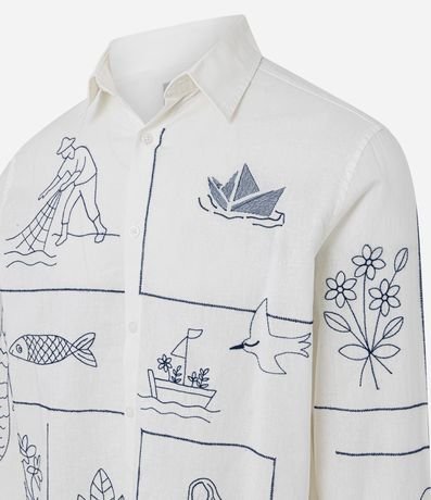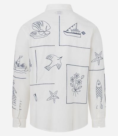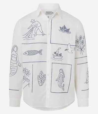 Ref: Camisa masculina comfort em linho, inspirada no fundo do mar, em patchwork bordado. Possui gola lapela, manga longa e abotoamento frontal. Sustentável, elegante e perfeita para looks casuais sofisticados.