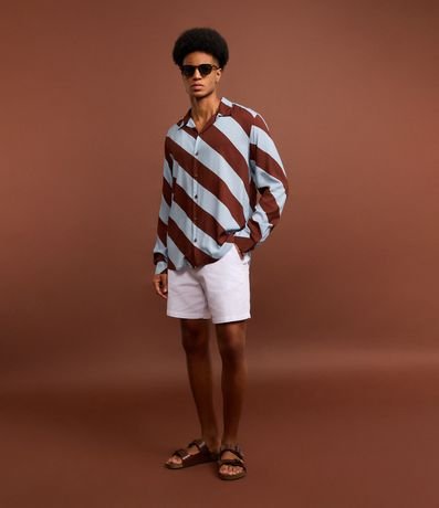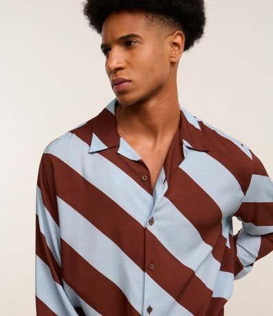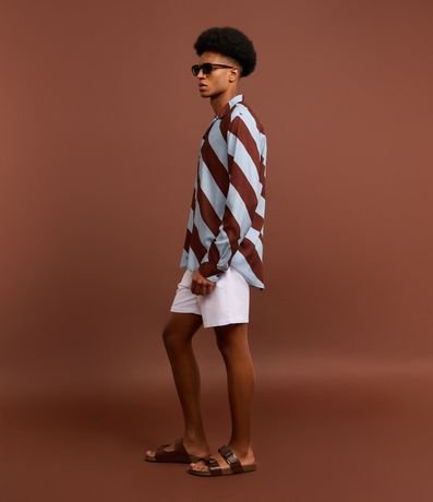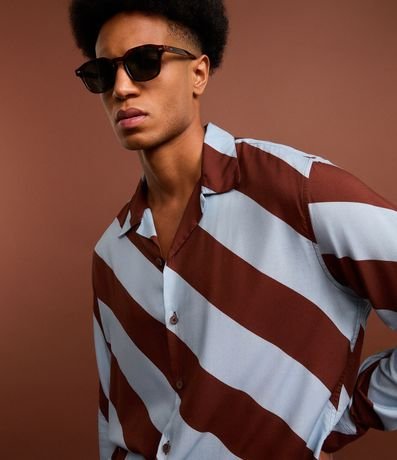 Ref: Camisa masculina confeccionada em tricoline mais sustentável através de boas práticas ambientais, no modelo comfort. Possui gola colarinho, manga longa, abotoamento frontal e estampa de listras largas.