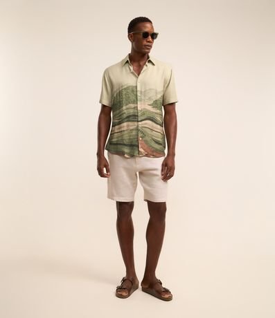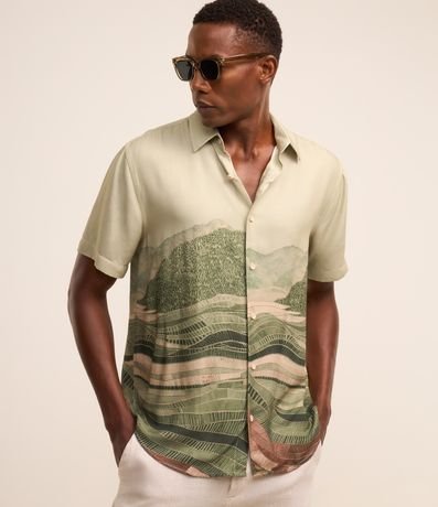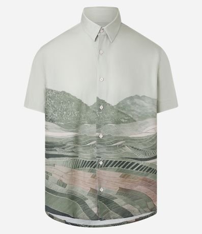 Ref: Camisa masculina confeccionada em voil mais sustentável, gola colarinho, abotoamento frontal. Peça no modelo comfort com estampa de cenário.