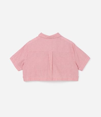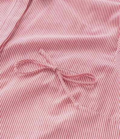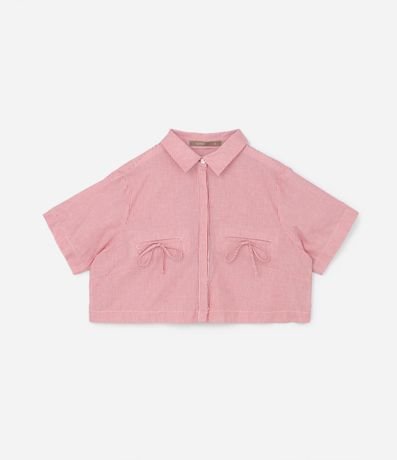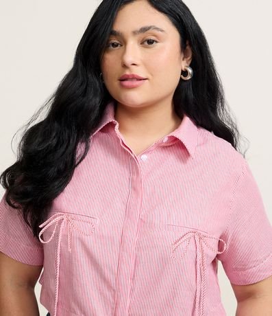 Ref: Camisa feminina Curve & Plus Size confeccionada em tricoline de algodão mais sustentável com boas práticas ambientais, peça no modelo cropped com gola colarinho, abotoamento frontal invisível, manga curta, estampa listrada. Seu diferencial bolsos fake frontais com lacinhos de cordinha.