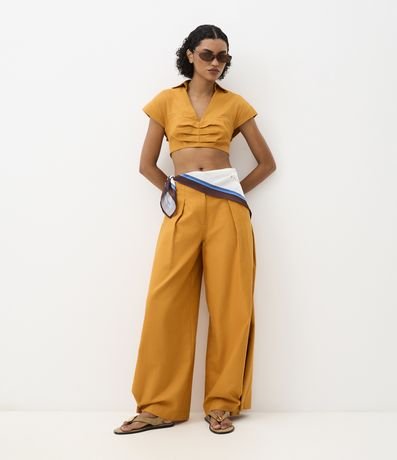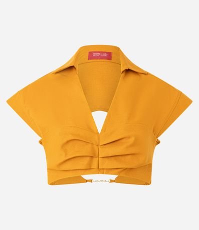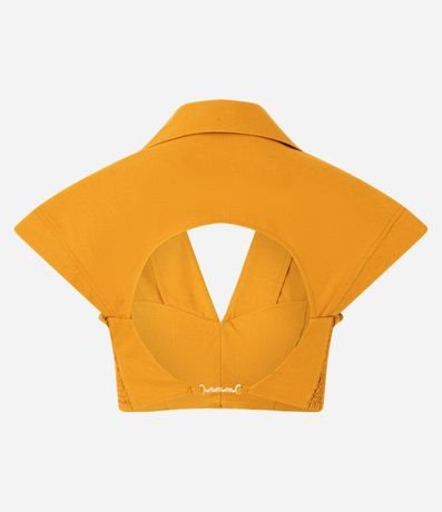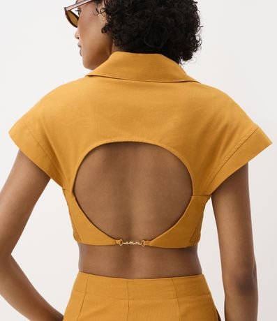 Ref: Camisa cropped, sem mangas, confeccionada em algodão com 05% de linho, com colarinho na gola, gola V, pregas no busto, abertura vazada nas costas com fechamento por aviamento metalizado diferenciado. Este produto possui material mais sustentável em sua composição, sendo ambientalmente mais responsável. A peça faz parte da collab Ateliê Mão de Mãe.
