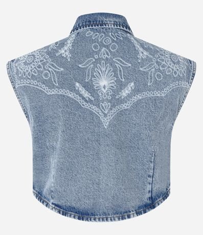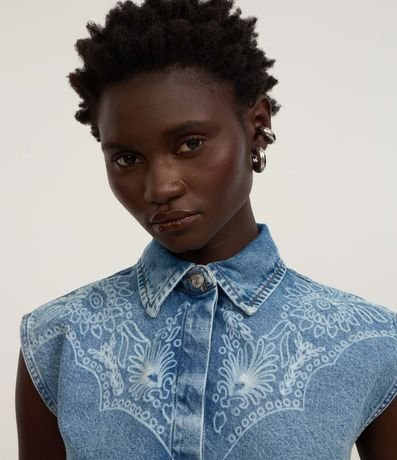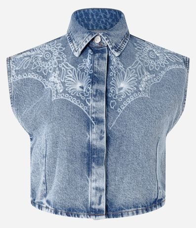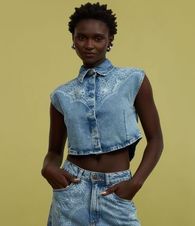 Camisa Cropped em Jeans com Botões e Arte em Laser