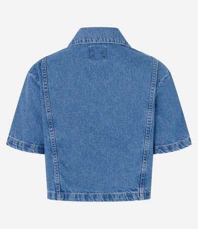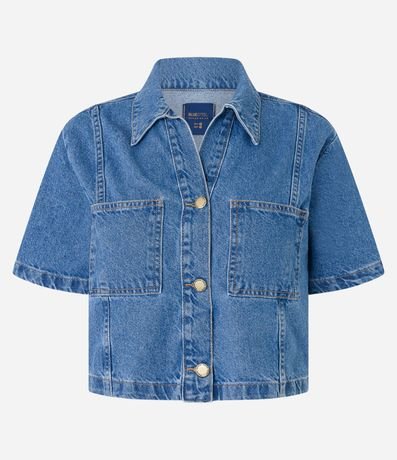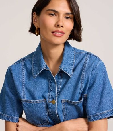 Ref: Camisa feminina no modelo cropped em jeans confeccionado em algodão certificado bci com boas práticas ambientais, gola colarinho, abotoamento frontal, manga curta, bolsos.