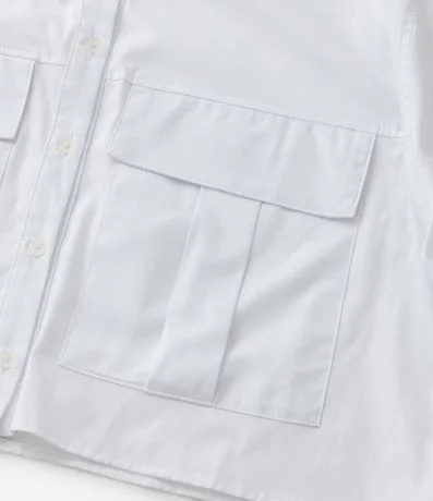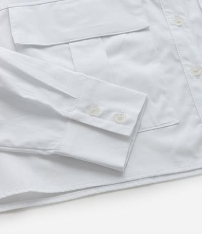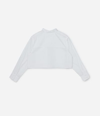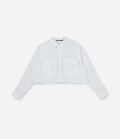 Ref: Camisa cropped confeccionada em tricoline de algodão mais sustentável, sem estampa. A camisa tem gola tradicional, abotoamento frontal, mangas longas, botões com três botões e dois bolsos frontais com lapela.