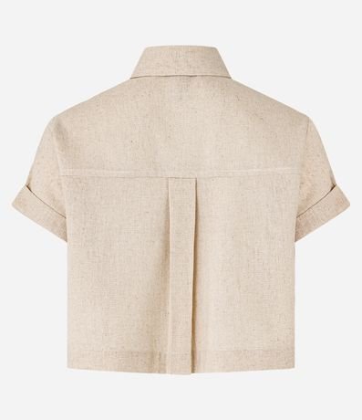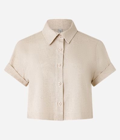 Camisa cropped com manga curta, confeccionada em viscose e linho. Possui botões para fechamento frontal e dobra nas mangas.