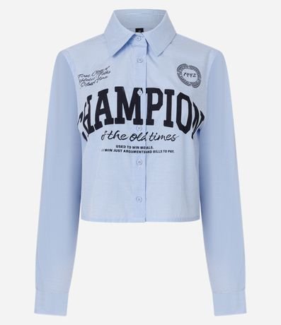 Ref: Camisa cropped de mangas longas, confeccionada em tricoline, com colarinho na gola, abotoamento frontal, listras verticais e estampa com lettering "Champion of The Old Times" e outras termos correlacionados. Este produto possui algodão certificado BCI em sua composição, além de ter sido produzido através de processos mais sustentáveis, sendo ambientalmente mais responsável.